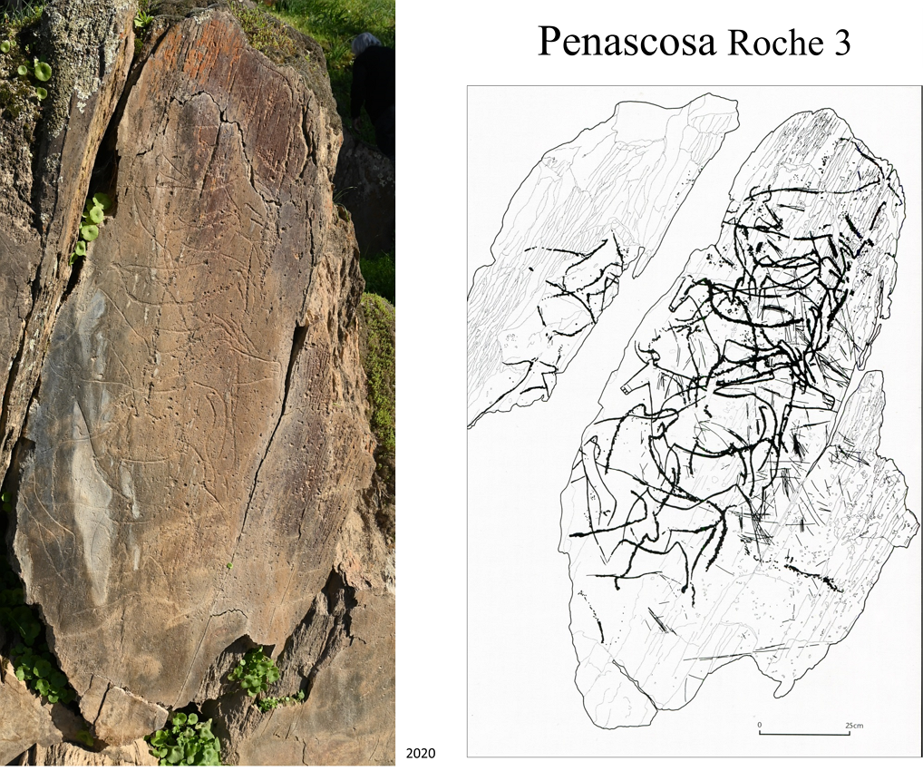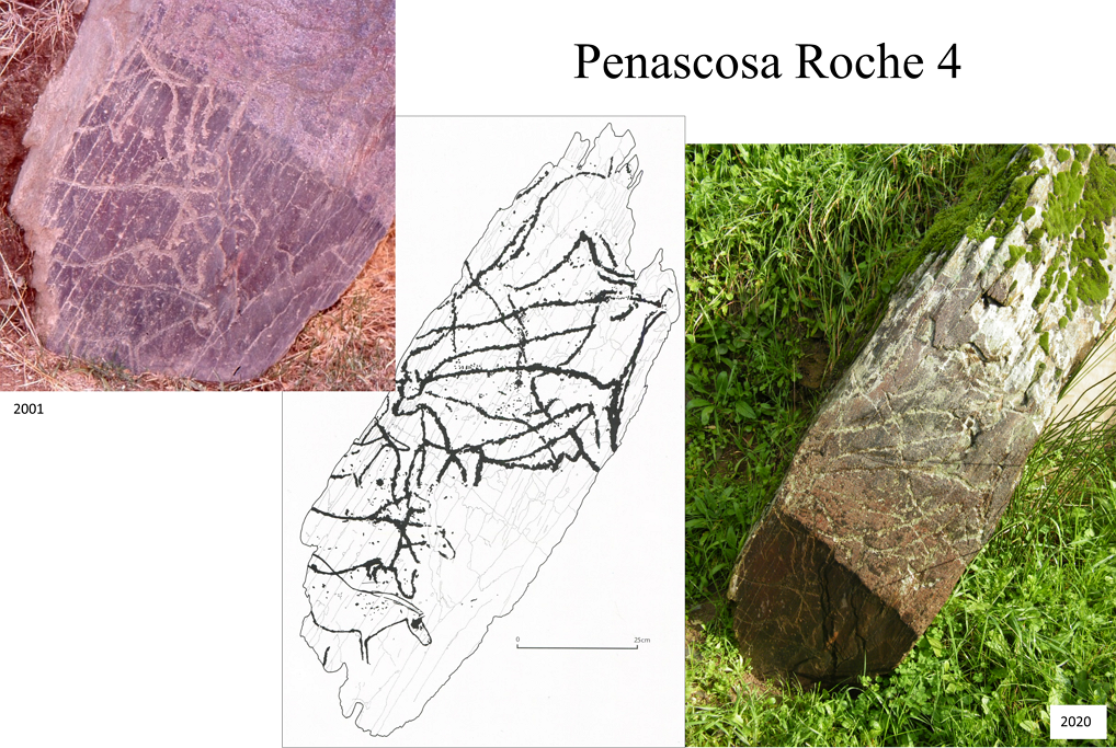 Par ailleurs, l'intérêt d'émettre une telle proposition (à défaut d'espérer la moindre validation...) ne se verra confirmé que si les gravures ici mentionnées sont contemporaines entre elles – ce que pourraient étayer des analyses micromorphométriques sur ces surfaces très altérées – ou si elles ont été lues de la sorte par le dernier graveur – ce que nous ne saurons probablement jamais. J'ai donc tout à fait conscience du côté hautement subjectif de ce qui vient d'être développé... Tout en considérant, à la suite d'Alain Testart, que la sécheresse des données archéologiques peut sans mal s'accommoder d'un regard spéculatif si ce dernier ne fait pas l'économie d'un minimum de rigueur.